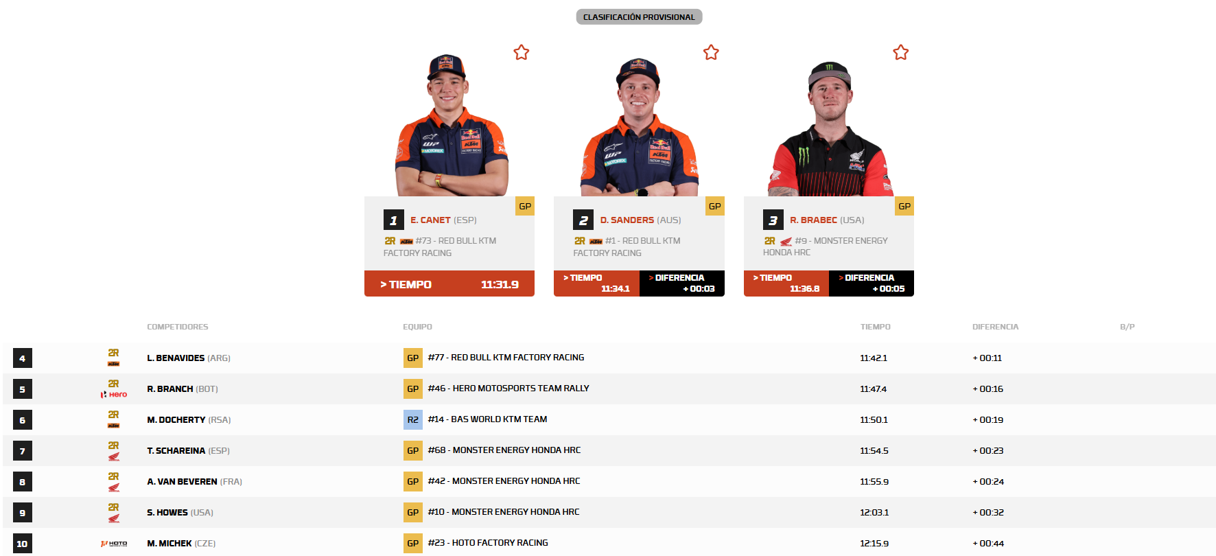 Canet pasó los 95 km. de recorrido total para marcar un tiempo de 11m31s9, superando por 3 segundos a su compañero de equipo, el australiano Daniel Sanders, mientras que el estadounidense Ricky Brabec, con Honda, llegó tercero a 5s.